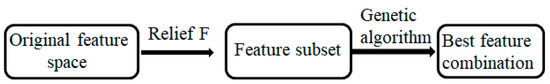 Facing the high dimensionality of features in multi-classification tasks, this paper proposes a combined feature selection method based on ReliefF algorithm and genetic algorithm. In order to eliminate irrelevant features and redundant features in the original feature space, the ReliefF algorithm was first applied to evaluate the feature importance based on the distance measurement between sample features, and features with higher feature importance were retained as a feature subset [16,17]. On this basis, genetic algorithm was applied to find the optimal feature combination under the current feature subset. The flow of the feature selection method is shown in Figure 5.