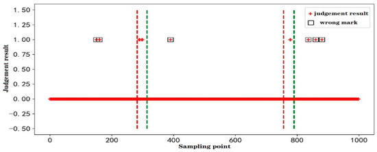The initial intention detection task of this action divided the data samples of 50 subjects participating in the experiment into a data set, of which the experimental data of 40 subjects were used as the cross-validation set, the total number of samples was 65,354, and the experimental data of the remaining 10 subjects were used as a test set, the total number of samples was 16,392. Figure 6 shows the test results of the participants’ initiation of action during the experiment. The red dashed line represented the start time of the action, and the green dashed line marked the end of the task. In the example in the figure, “0” and “1” were used to indicate the rest state and task state, respectively. If it was judged as “0” in the rest period, it was regarded as correct, and when it was judged as “1”, it was regarded as a misjudgment, it was judged in the task segment. If it was “1”, it was deemed correct.