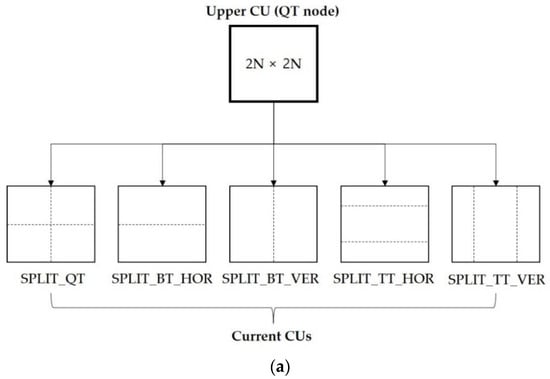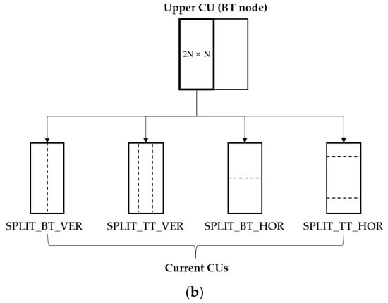 In this paper, we define the relationship between the upper CU and current CUs. The upper CU can be either a QT node with square shape or a MTT node with square or rectangular shapes covering the area of the current CU. For example, the divided QT, BT, and TT CUs can have the same upper CU, which is the QT node with 2N × 2N, as illustrated in Figure 2a. Similarly, a MTT node is also regarded as an upper CU for further partitioned sub-MTT nodes, as depicted in Figure 2b.