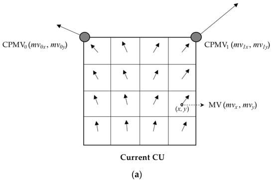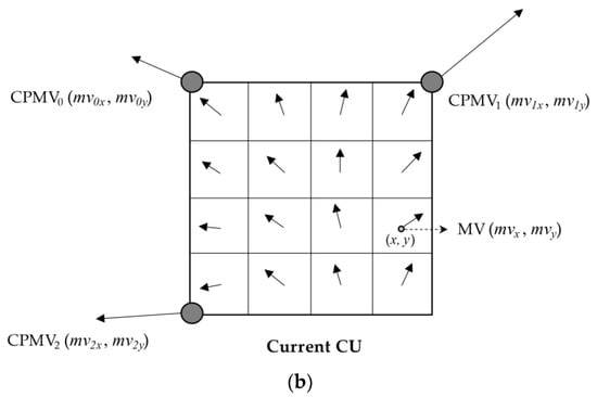 In general, inter prediction searches the motion-compensated block from the previously decoded reference frames by using conventional motion estimation (CME). CME conducts a kind of block-matching algorithm based on the translational motion model. Because CME cannot efficiently describe complex motions in natural videos, such as zooming and rotation, VVC has newly adopted not only CME but also affine motion estimation (AME) to overcome the limitations of the translational motion model at the expense of higher encoding complexity. VVC provides two affine motion models in the process of AME, which are the four-parameter affine model (affine_4P) and the six-parameter (affine_6P). Because VVC performs the affine prediction in the unit of sub-block with the size of 4 × 4, the affine MVs of each sub-block are derived from a two-control-point MV (CPMV0, CPMV1) or a three-control-point MV (CPMV0, CPMV1, CPMV2) depending on affine_4P or affine_6P, respectively. As shown in Figure 3, CPMV0, CPMV1, and CPMV2 indicate the motion vectors of the top-left corner control point, the top-right corner control point, and the bottom-left corner control point, respectively. In this paper, the horizontal and vertical MVs of CPMV0, CPMV1, and CPMV2 are notated as , ,  and , respectively. For the affine_4P, MV  at center sample location (x, y) for a sub-block is derived as in Equation (1).