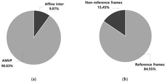 While AME enables efficient prediction of the complex motions beyond the reach of translational motions, it causes heavy computational complexity in the VVC encoder. According to the tool-off test of affine prediction [], the coding loss and the time savings are 3.11% and 20%, respectively. Figure 4a shows the distribution between affine inter mode using AME and AMVP mode using CME in the RA configuration of JVET CTC. In addition, we investigated the distribution of affine inter mode on the reference and non-reference frames, as shown in Figure 4b. In RA configuration of VVC, it specifies group-of-picture (GOP) size to support the hierarchical encoding structure along the different temporal layers (TLs). The frames with the highest TL value are treated as the non-reference frames in VVC. Figure 4b indicates that affine inter modes rarely occurred in non-reference frames. Although affine inter mode does not frequently occur during the VVC encoding process, it contributes to improving the coding efficiency. It means that the fast encoding scheme of AME should be carefully designed in order to minimize the coding loss. In this paper, we propose a fast affine prediction method to reduce the computational complexity of AME with unnoticeable coding loss.