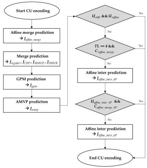 Figure 5 shows the block diagram of the proposed method, which modified the existing VVC encoder with the gray-shadowed early-termination rules. Firstly, if the upper CU is not encoded as affine mode and cbf0, it means that the current CU is likely to have the translational motion. In that case, the affine inter mode of the current CU is skipped without any AME process, as shown in Figure 5. In addition, if the current frame is the non-reference frame with the highest TL, and the best mode of the current CU is not encoded as affine merge, AME is also skipped based on the distribution of Figure 4b. Secondly, we assumed that there are correlations between the current CU and upper CU in terms of the affine model for AME. Therefore, the current CU only performs the AME using affine_4P if the RD cost of affine_4P is smaller than that of affine_6P during the encoding of the upper CU, and the best mode of the current CU is encoded as the affine merge mode with affine_4P before encoding the AME process.
