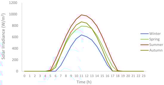 Average hourly solar irradiance for the different seasons in Riyadh, 2017 [].