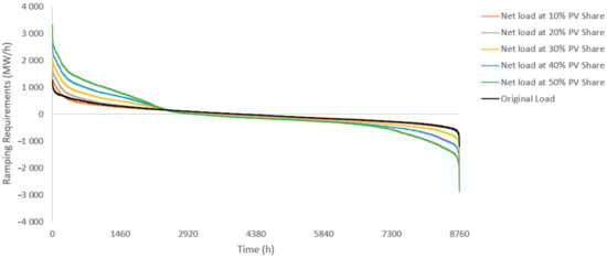 The increase share of the PV system tends to increase towards these conventional generation technical cycling data. In particular, the ramping constraint that exceeds the ramping constraint threshold leads to the loss of the load phenomena []. The Loss of Load Probability (LOLP) is defined as the probability of the available generation capacity that is unable to meet the load during a given period []. Furthermore, the loss of load event (LLE) in this research can be defined as the moment when the absolute net load power ramp (|NLPR|) exceeded the grid’s ramping constraint (GRC) of its conventional generation system. In this paper, the GRC is based on the maximum power ramp of the original load profile without the inclusion of the PV system. In doing so, a more realistic assessment of the current ramping requirement of the grid’s conventional generation system is given.