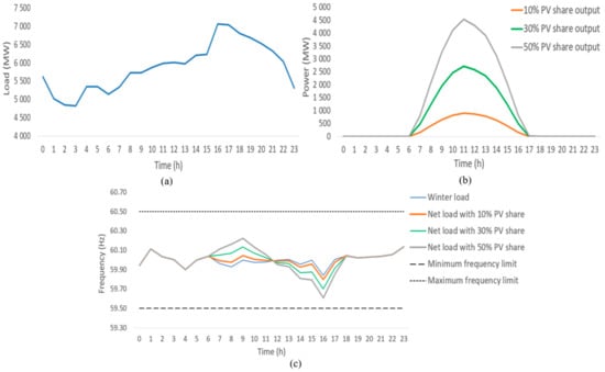 (a) January’s average hourly daily load profile of Riyadh, 2017; (b) January’s PV output at various share capacities in Riyadh, 2017; (c) grid frequency representation of the January load of Riyadh, 2017, with the inclusion of the PV system at various capacities without grid constraints.