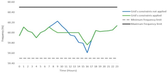 Figure 16 shows that the frequency stability was dependent on the net load’s pattern in terms of the netload power ramp, the size of the PV system, and the PV system’s output in terms of the magnitude of the solar irradiance. The sharp decrease in the frequency was due to the sharp increase of the load in the afternoon period, which coincided with the depletion of the PV system’s power. However, when the grid constraints were applied in this case, the frequency changed for the better, which is clearly shown in Figure 17. This positive affect on the frequency stability was due to the reduced participation of the PV system.