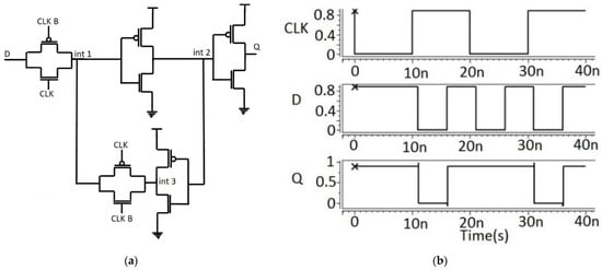 (a) Static D-latch schematic; (b) input and output signals of the Static D-latch.