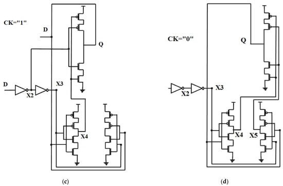 The schematic of the novel D-latch is shown in Figure 2a. The D-input passes through two paths; one path is integrated by one switch connecting the input to the output D-latch and the other path is formed by two inverters and one switch that is ON when CK = β1β. The βX4β and βX2β nodes are connected to the first C-element to delete the SET of D data; this C-element increases the delay because it is ON when CK = β1β. The third and fourth C-elements are used to store the output for the holding time. The second C-element of the feedback path is ON when CLK = β0β and provides the feedback in the hold mode. Storing the D-input in two different C-elements makes the structure reliable against SEU. The C-element with the same inputs works as an inverter; however, when the values of two or three inputs are not the same, the output of the C-element does not change. For example, when one SEU occurs in one of the two or three different paths, the output node does not change. The layout of the proposed D-latch is shown in Figure 2b. The equivalent schematics for each case (CK = β0β and CK = β1β) are also shown in Figure 2c,d, respectively.