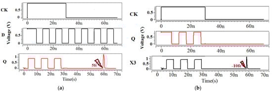 To investigate the SEU capability of the proposed D-latch, a number of SEUs are injected to various internal nodes. Then, the output signal is monitored to prove immunity against SEU at different nodes. The model of injected charge is based on an exponential current source [23]. The charge injection with different values is introduced during 0.3 ns and 0.9 V supply voltage at different internal nodes in reference CMOS technology at room temperature. Since different nodes can tolerate different values of charge injections, the maximum value of charge injection has been calculated for each specific node to produce voltage spikes slightly over the supply voltage and under zero volts [7,24], as shown in Figure 3, Figure 4 and Figure 5 to test SEU immunity. The shape of the current source can be expressed mathematically [29]: