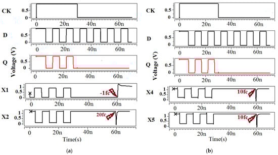 Test results when the output is β0β during the holding time: (a) negative and positive SEU injection to βX1β and βX2β nodes, respectively; (b) positive SEU injection to βX4β and βX5β nodes, respectively.