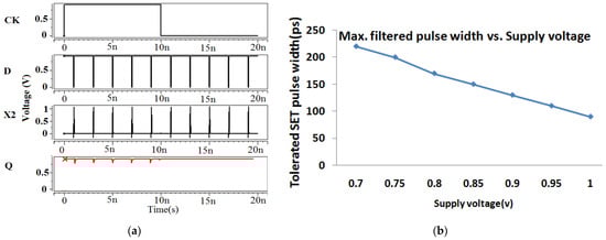 (a) SET pulse filtering capability of the proposed D-latch; (b) maximum pulse width of SET filtered by the proposed D-latch at various supply voltages.