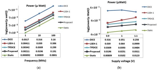 Power consumption of various D-latches: (a) at three frequencies from 1 MHz to 100 MHz and 0.9 V power supply voltage; (b) at three supply voltages and 10 MHz input frequency.
