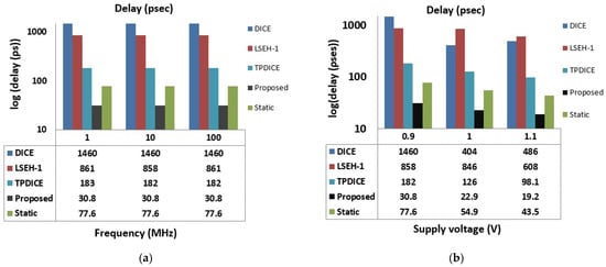 Delay of various D-latches: (a) at various frequencies from 1 MHz to 100 MHz and 0.9 V power supply voltage; (b) at three supply voltages and 10 MHz input frequency.