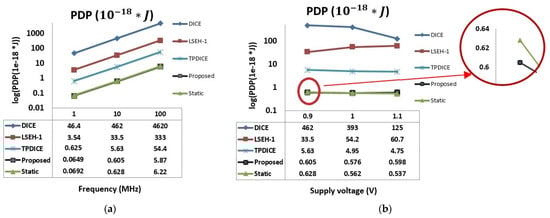 PDP of various D-latches: (a) at various frequencies from 1 MHz to 100 MHz and 0.9 V power supply voltage; (b) at three supply voltages and 10 MHz input frequency.