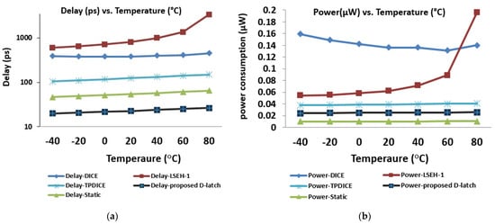 As expected, raising the temperature increases the delay (above 30 Β°C for DICE) due to the lower electrical conductivity (lower carrierβs mobility) and increases the power consumption (above 60 Β°C for DICE), as high temperature increases current leakage [33]. However, the temperature effect on the proposed D-latch is lower than in other D-latches, such as LSEH-1, DICE, and TPDICE-based D-latches, as deduced from Figure 10 (a comparative study in terms of a temperature coefficient has been included in Appendix A).
