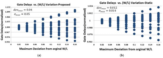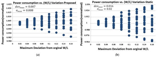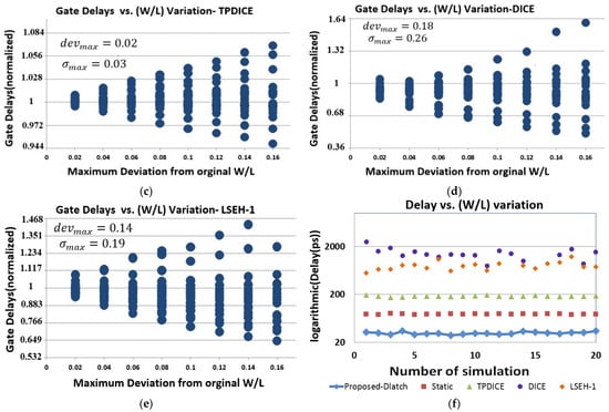 Finally, process variability, such as variation of transistor aspect ratio (W/L) or threshold voltage are analyzed. Monte Carlo simulations constitute a helpful tool to assess how the delay and power consumption are affected by these variations. A Gaussian distribution has been considered to model (W/L) and threshold voltage variability. The maximum deviations from the original (W/L) values of transistors and threshold voltages are set from 2% to 16%, which is the probable range of change normally used for comparison in this kind of study [1,7,27]. For each maximum deviation, 20 simulations are carried out to study the effect of (W/L) and threshold voltage variability on the delay and power consumption. Figure 11 shows the delay as the result of (W/L) transistor variability. In Figure 11a, the delay changes of the proposed D-latch as a result of (W/L) transistor variations are shown. It can be seen that the results have approximately the same delay variation as that of the TPDICE-based D-latch (Figure 11c), and the Static D-latch (Figure 11b), while it is much better than that of DICE (Figure 11d) and LSEH-1 D-latches (Figure 11e). The results are normalized to the delay of the original D-latch without any process variation. This normalization helps better visualize the effect of (W/L) transistor variations on delay. Figure 11f clearly shows the minimum variations of delays for the proposed D-latch when compared to other D-latches in maximum deviation.