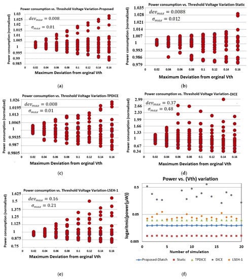 Threshold voltage variation effect on power consumption: (a) proposed D-latch (b) Static D-latch (c) TPDICE-based D-latch (d) DICE (e) LSEH-1 (f) power consumption of D-latches with maximum deviation, 0.16, from original threshold voltage.