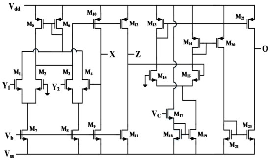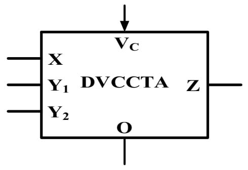 DVCCTA is an active analog hybrid building block designed by cascading differential voltage current conveyor (DVCC) with an operational transconductance amplifier (OTA) where DVCC is a differential amplifier with unity gain feedback and current mirror [23,24]. The symbol of DVCCTA is shown in Figure 1. The impedance at input terminal Y1 and Y2 are very high, so that the current through these terminals is zero. Terminal X provides the difference between the voltages appearing at terminals Y1 and Y2. The same current flows through both Z and X terminals. Transconductance (gm) is responsible for converting the current at terminal O to an analogous voltage at terminal Z. The tuning of the transconductance can be achieved by external voltage Vc. Equation (1) denotes the port relationship in matrix form for an ideal DVCCTA: