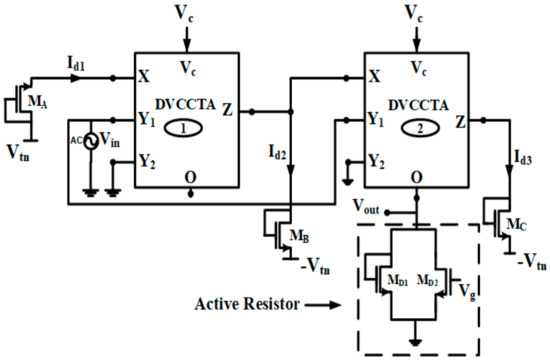 For the negative half-cycle of the applied input voltage (), transistor MA, MB, and MC are in saturation, cut-off, and saturation region respectively. The applied input voltage is conveyed from the terminal Y1 of DVCCTA-1 to its X terminal using the port relationships given in (1) and produces current passing through the NMOS transistor MA. The same current in the same direction flows across the terminal X and Z of DVCCTA-1. Since the transistor MB is in the cut-off region, the current through terminal X of DVCCTA-2 is the same as the current through the Z terminal of DVCCTA-1. Using the port relationships given in (1), the current flowing through terminal Z and X of DVCCTA-2 is identical in the same direction. The current passing through transistor MA can be written as: