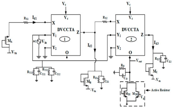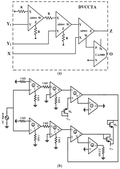 It can be observed that the obtained Equation (23) is non-linear due to the presence of parasitic components for the negative half-cycle. The voltage at terminal Z of DVCCTA-2 can be written as: