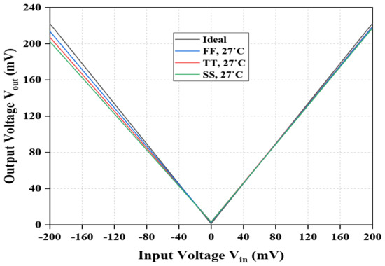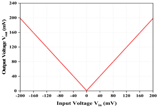 This section shows the simulation outcome of the proposed electronically tunable full-wave rectifier circuit simulated using 0.25 µm TSMC CMOS technology having a supply voltage of ±1.5 V. The internal structure of DVCCTA shown in Figure 2 is used for simulation considering the applied bias voltage Vb = −1 V. The W/L or commonly known as the aspect ratio of transistors used for implementing DVCCTA is provided in Table 1. The threshold voltage of NMOS transistor MA, MB, and MC used in Figure 3 are 0.425 V, 0.423 V, and 0.44 V respectively are chosen to compensate for the current gain and voltage gain due to non-ideality as discussed in Section 4. The transconductance parameter of DVCCTA varied depending on the range of controlling voltage Vc. The value of Vc lies in the range of −0.5–0.5 V. The output of the rectifier circuit is obtained from terminal O of DVCCTA-2 by controlling Vg. The value of the RD resistor is around 2.5 kΩ. Figure 5 shows the DC voltage transfer characteristic of the full-wave rectifier circuit at Vc = 0.5 V, Vg = 0.6 V and it can be observed that the maximum input signal amplitude obtained is approximately 200 mV. The transistor at the input stage of the internal structure of DVCCTA shown in Figure 2 is no longer in the saturation region when the input voltage lies outside this range.