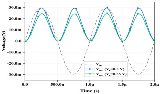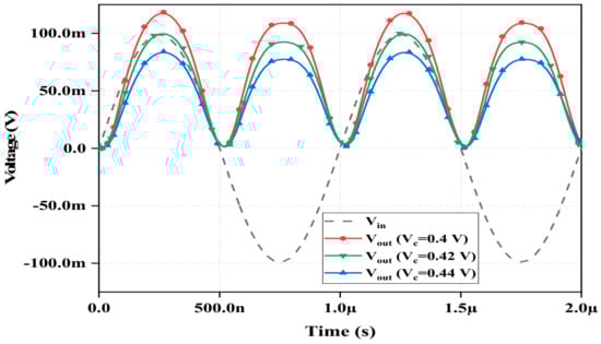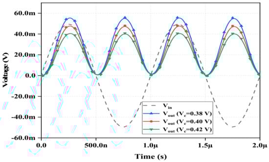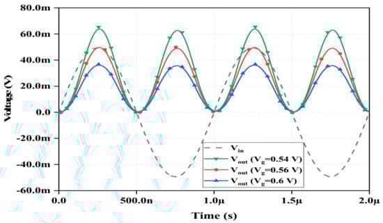 The transient response of the rectifier circuit is presented in Figure 6, Figure 7 and Figure 8 considering the magnitude of the applied input signal as 30 mV, 50 mV, and 100 mV, respectively, at frequency 1 MHz. It can be observed from Figure 6 that the rectified output signal is obtained at VC = 0.3 V and 0.35 V considering the constant value of Vg = 0.56 V when the input signal is of 30 mV amplitude at 1 MHz frequency. It can be observed from Figure 7 that the rectified output signal is obtained at VC = 0.38 V, 0.40 V, and 0.42 V considering the constant value of Vg = 0.56 V when the amplitude of the applied input signal is 50 mV at 1 MHz frequency. The rectified output coincides with the input signal at VC = 0.40 V. It can be observed from Figure 8 that the rectified output signal is obtained at VC = 0.40 V, 0.42 V, and 0.44 V considering the constant value of Vg = 0.56 V taking input signal as 100 mV in amplitude and having 1 MHz frequency. The rectified output coincides with the input signal at VC = 0.42 V. It can be observed from Figure 9 that the rectified output signal is obtained at Vg = 0.54 V, 0.56 V, and 0.60 V considering the constant value of VC = 0.34 V while using input signal of amplitude 50 mV at 1 MHz frequency. The rectified output coincides with the input signal at Vg = 0.56 V. Figure 6, Figure 7, Figure 8 and Figure 9 show that the rectified output of the proposed rectifier circuit can be tuned by changing the value of VC and Vg. The radical temperature change in the time domain and the DC characteristic is shown in Figure 10.
