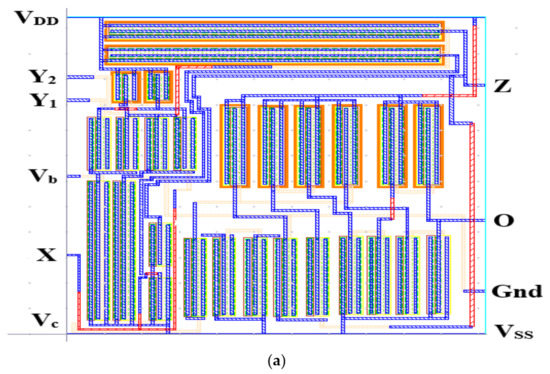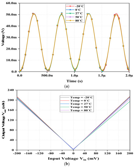 A variable ambient temperature from −20 to 80 °C is considered to show the robustness of the presented design. It can be observed that the rectified signal amplitude shows a minute deviation with temperature. The performance study that includes the Monte Carlo Sampling simulation offers a unique tool to study and analyze the robustness as well as the uncertainty of the proposed full-wave rectifier circuit for transistor mismatch in the designed circuit when the input signal of amplitude 50 mV is applied at frequency 1 MHz. MCS simulation is done for 200 runs by considering a 3% mismatch in gate oxide thickness (Tox) of all transistors as shown in Figure 11a. The DC Monte Carlo analysis is shown in Figure 11b. It is seen that the rectifier circuit is still operational within acceptable limits despite having a slight deviation in the output response. Corner analyses, such as SS, FF, and TT, have been carried out as shown in Figure 12 and even these analyses show that the rectifier circuit presented here is capable of exhibiting superior operational performance. Henceforth, this makes the proposed circuit suitable in operation under radical conditions and over a wide range of temperatures as well. The layout of the proposed full-wave rectifier circuit is created and depicted as shown in Figure 13 and post-layout simulation has been done to present the effect of the involved parasitics on the overall performance of the rectifier circuit. It covers an overall layout area of 9044 µm2 (133 µm × 68 µm). It can be observed from Figure 13c that the transient response of the pre and post-layout simulation differs slightly with respect to one another which clearly shows the effects of parasitic in the design. Due to the presence of significant interconnection resistance, the distributed resistance and parasitic capacitance will influence the overall performance of the rectifier design and even lead to delays between pre- and post-layout results. The important performance parameter of the rectifier circuit is the DC value transfer (PDC) and RMS error (PRMS) [27,28], which are used to show the accuracy of the rectifier. In the ideal case, the values of PDC and PRMS should be 1 and 0, respectively. The simulation results of PDC and PRMS have been shown in Figure 14. It can be seen that the deviations in the actual output voltage can be observed by increasing the frequency and decreasing the magnitude of the input signal. The PDC decreases below one and PRMS increases when the magnitude of the input signal decreases from 100 mV to 10 mV. The simulation results obtained at frequency 1 MHz and Vin = 100 mV have been compared with the results provided in [8,29,31] as shown in Figure 15 and it can be observed that [8] responds slowly and has a dead zone due to the presence of diode. Initially, [29] shows phase difference compared to the input signal, and [31] shows variations in the magnitude of the output response.