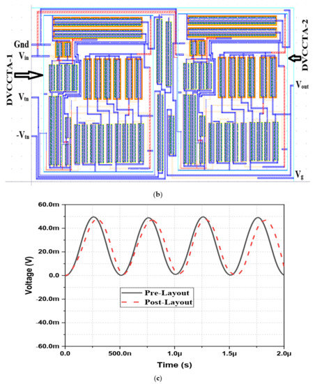 It can be observed from the above equation that the gain obtained in the positive and negative half-cycle of the applied input voltage signal is not identical. So, keen attention must be paid while implementing DVCCTA to make sure that the output voltage is given by (10) is met. To compensate for the non-unity gain αi, βi, and γi, a slight adjustment in the biasing voltage used to bias the NMOS transistor is needed.