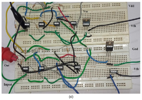 Since the monolithic IC of DVCCTA is not commercially available, the presented electronically tunable full-wave rectifier circuit based on the current-mode scheme was implemented on the breadboard, using commercially available CA3080 and AD844AN circuits to experimentally justify the operation of the circuit. The MOS-based rectifier design as shown in Figure 3 is implemented using the macro model circuit consisting of commercial ICs for performing the experiment as shown in Figure 16. DVCCTA implementation requires one CA3080 and three AD844AN ICs along with four passive resistors (R), each resistance having a value of 1 kΩ. Since two DVCCTA blocks are used along with NMOS transistors, a total of six AD844AN and two CA3080 ICs with three NMOS transistors (IRF540N) is required for implementing the experimental prototype. Figure 16a shows the implementation of DVCCTA using commercial ICs. Figure 16b shows the micromodel circuit implementation of the proposed rectifier design using commercial ICs and its implementation on the breadboard is shown in Figure 16c. A sinusoidal input having an amplitude of 50 mV is fed as an input to the circuit and component parameter RD of 2.2 kΩ is considered to obtain the output waveform curve as shown in Figure 17. Commonly available Keysight—DSOX3054A digital storage oscilloscope is used for this purpose. The amplitude of the output waveform depends on the bias current and increment in the amplitude is observed with the increment in bias current. The experiment is performed at a frequency of 500 kHz. Commercially available IC CA3080 is current biased (IB) as shown in the DVCCTA implementation in Figure 17 and it is exploited for varying the amplitude of the output waveform. It is clearly apparent that the amplitude of the output waveform in the presented precision rectifier varies in accordance with the bias current of the OTA used in the implementation of DVCCTA.