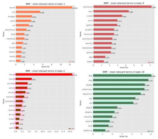 In order to evaluate the results of the algorithm, the most relevant terms have been identified for each resulting topic. Then, by reviewing the main terms for each topic, it is possible to determine if that words really represent the content of the topic. An example is shown in Figure 2, where the most relevant terms have been identified for 4 different topics, proving how well the algorithm identifies the terms associated with each one. As it can be seen, all of them are unambiguously related to their defined categories. Topic 1: Travel. Topic 2: Arts & Entertainment. Topic 9: Personal Finance. Topic 10: Pets.