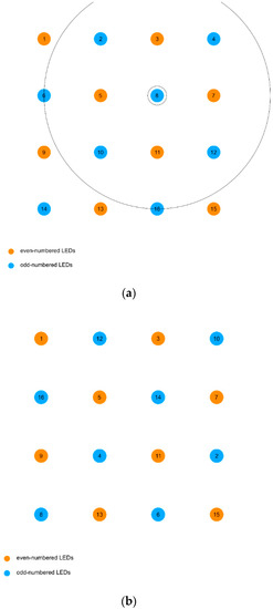 For the sake of description, we assumed a scenario that required 32 LEDs and divided them into two groups equally; each group consists of eight odd-numbered LEDs and eight even-numbered LEDs. In the first group, the odd-numbered LEDs are numbered 1, 3, …, 15, and the even-numbered LEDs are numbered 2, 4, …, 16. LEDs of different labels are arranged in the way shown in Figure 2a. The odd-numbered LEDs are in orange, and the even-numbered LEDs are in blue. Then, we need to figure out some other permutations, so that in each of these permutations, the adjacent odd-numbered LEDs and even-numbered LEDs have different numbers. Through analysis, it is found that as long as the order number of the even-numbered LEDs next to the odd-numbered LEDs is different, the nonredundant order number of the odd-numbered LEDs next to the even-numbered LEDs can be guaranteed. Thus, keeping the odd-numbered LEDs in position is accomplished by moving the even-numbered LEDs, to get different permutations. Take the LED number 8 as an example: In the new permutation, if the No.8 LED is not adjacent to the LEDs No.3, No.5, No.7, and No.11, the new position of No.8 LED must be outside the circle. As a result, there are only two ways in which the numbers of neighbors are completely different in the system. In Figure 2b, we give this new permutation.