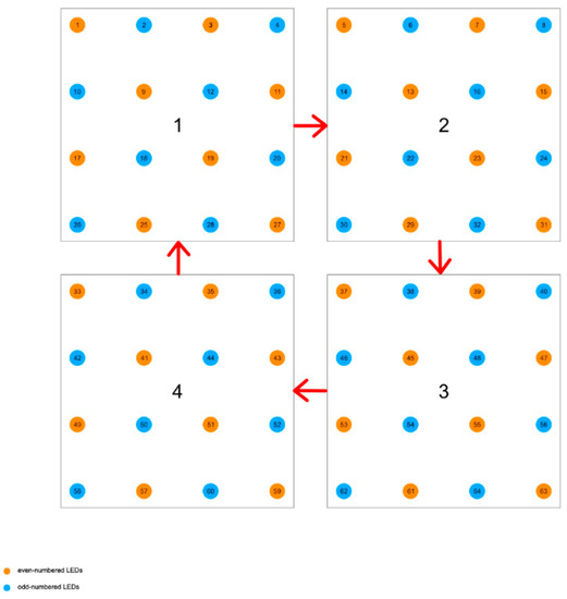 Then, we had a system with 512 LEDs and divided them into eight groups equally, with each group consisting of 64 odd-numbered LEDs and 64 even-numbered LEDs. In each group, the odd-numbered LEDs are numbered 1, 3, …, 63, and the even-numbered LEDs are numbered 2, 4, …, 64. The first group is arranged as shown in Figure 3. In one group, we divided it into four smaller groups, and labelled them as A, B, C, D. Keeping the odd-numbered LEDs in position, we moved the even-numbered LEDs in the direction of the arrow. Four moves will bring each part back to its original position. In this way, we can get four permutations. Then, we switch the even-numbered LEDs in A, B, C, and D of each of the four arrays in the order shown in Figure 2a; four other new permutations are obtained. In all these eight permutations, even-numbered LEDs next to the same odd-numbered LEDs have different numbers; as a result, regions can be divided into eight parts.