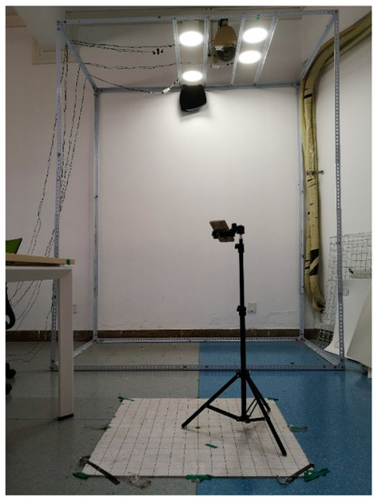 We conducted an experiment to verify the performance of the proposed system and verified our theoretical analysis. Four LEDs are installed in a cube frame. According to our algorithm, the three complete lights in the picture will be automatically selected as LEDs used in the positioning algorithm. If all four LEDs can be fully recognized, the three lights closest to the image center are selected as the positioning LEDs, so as to reduce the impact of lens distortion on positioning accuracy. Our experimental facility is shown in Figure 6, and the system parameters are listed in Table 2.