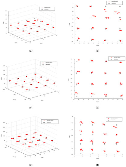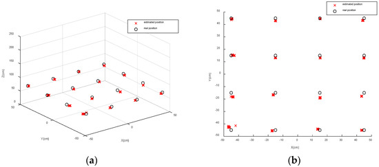 The experimental area is 350 cm × 200 cm × 250 cm, and we chose a height of 0.7 m, and there are 16 evenly distributed test points at the height. At each point, the proposed Triple-Light Positioning algorithm is applied to calculate the position in the experiment. We did ten trials at each positioning point to avoid random error. The resulting positioning effect is shown in Figure 7a,b.