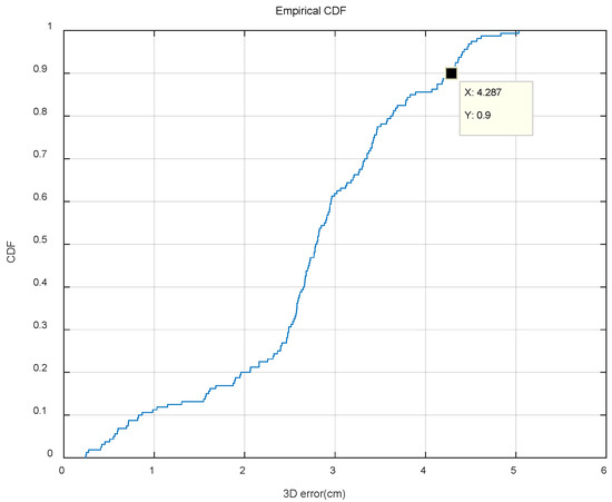 As shown in Figure 7, the result of the experiment performs well. By comparing the results obtained with the actual data, we can get the maximum error of 5.03 cm and the average error of 2.76 cm. Figure 8 gives the cumulative distribution function (CDF) of the positioning error. In the CDF plot, we can see that 90% of the points are less than 4.287 cm.