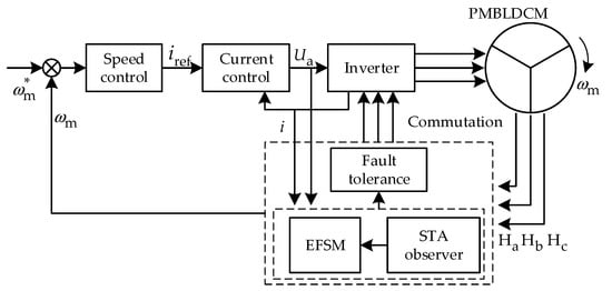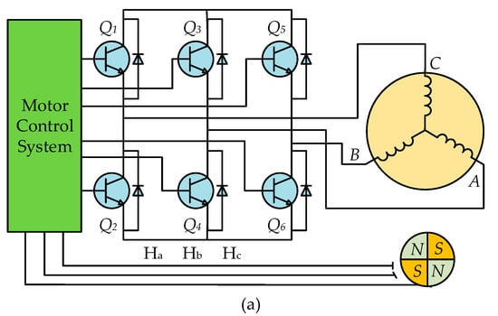 Permanent magnet brushless direct current (PMBLDC) motors have been widely used in various industrial and commercial fields, benefit from the characteristics of high power density, simple structure, and low cost [1,2,3]. During the regular operation of a PMBLDC motor, the control system needs to acquire the position of its rotor in real-time and apply the corresponding voltage vector on its stator winding to produce the required electromagnetic torque by its rotation [4,5,6,7]. Although different sensorless control methods have been proposed in many literatures, there are many limitations in the applications of these approaches, especially in the startup stage and the speed range [8,9,10,11]. Therefore, the PMBLDC motor drives with position sensors are usually preferred in most applications. The Hall sensors have advantages of simplicity and inexpensive, which make them well suited for the position sensors of the PMBLDC motor drives. Hence, the Hall sensors play a considerable important role in the motor drives [12,13,14]. The Hall sensors may fail due to various reasons (such as harsh environments, faulty connections, violent vibration, etc.), which can result in that the feedback signal of the faulty Hall sensor cannot correctly reflect the position of the rotor [15,16]. Once there is a fault in the Hall sensors, the dynamic performance of the motor drives will be significantly reduced or even overcurrent, which can lead to extensive damage to the whole system [17,18,19].