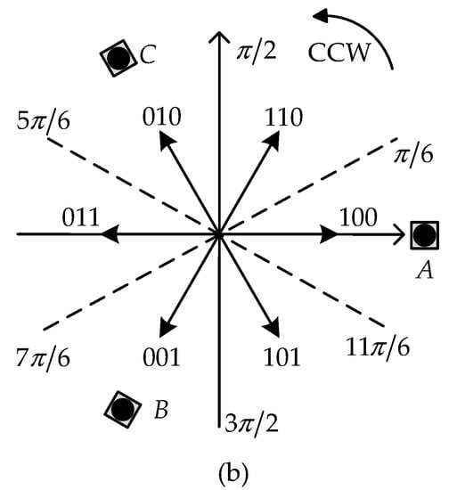 The structure of the PMBLDC motor drives is shown in Figure 1a, which comprises a PMBLDC motor with three Hall sensors, a voltage-source inventor, and a motor control system [32,33]. The three Hall sensors A, B, and C are fixed at the stator. When the rotor turns to different positions, the Hall sensors will output different Hall signal , , and . The rotor positions are divided into six sectors by the different Hall signal with an interval angel of rad, as shown in Figure 1b.
