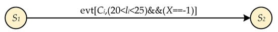 In Figure 6, and are two system states, is a system input. There are two boundary conditions in the state transition: variable constraint and time constraint . When the system inputs is , the state transition from to holds true only when the system variable occurs in the valid time zone . When the system variable occurs in the invalid time zone or , or system variables other than appear in the time zone , the state transition from to is false.
