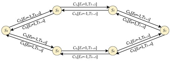 According to the above analysis, it can be found that the second state of a basic FSM is determined by the current state, the system event, and the transition function. Meanwhile, it can only transfer between the finite states. Similarly, during the working process of the PMBLDC motor drive, different MOSFETs need to be conducted according to the rotation direction of the motor and the different rotor positions. Therefore, the concept of the FSM can be combined with the PMBLDC motor drives, with the Hall signal as the system state and the conducted MOSFETs as the system event. The six normal Hall signals and two fault Hall signals are marked with , as shown in Table 2. The different conducted MOSFETs are marked with , as shown in Table 3.