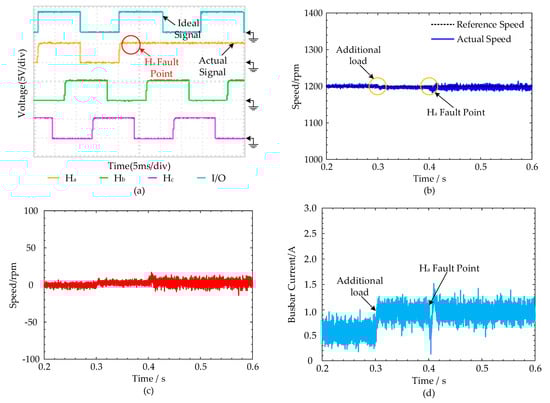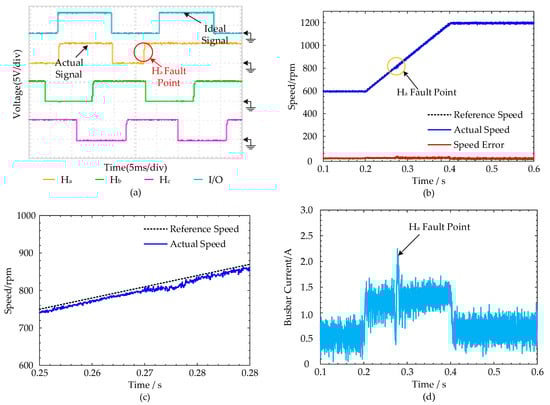 Fault-tolerant control experimental results at load variation: (a) the Hall signal curves of the motor; (b) the speed curves of the motor; (c) the speed error curve at the fault point; (d) the busbar current of the motor.