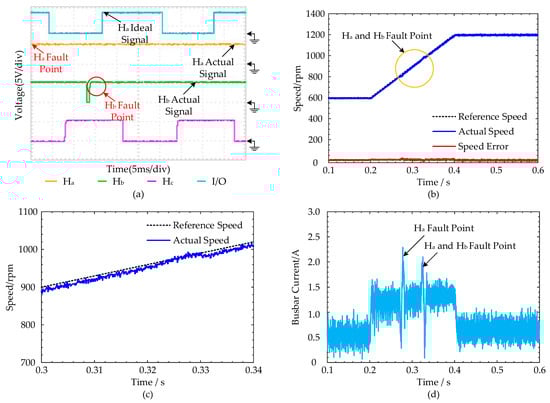 Double Hall fault-tolerant control experimental results: (a) the Hall signal curves of the motor; (b) the speed curves of the motor; (c) the detail speed curves at the fault point; (d) the busbar current of the motor.