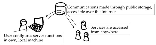This work concentrates on reducing the complexity of hosting a server. In particular, we propose a method that requires the configuration of a single device—the user’s own machine, such that the user can fully customize it and work in familiar settings without the need to consider remote devices and their heterogeneous environments. The method uses public, unpaid cloud storage and transmits messages and data through this storage (Figure 1). As the storage is free of charge and publicly accessible, no cost is incurred, and the user is not required to configure firewalls.