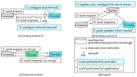 We begin by describing two common methods of hosting a networking application visible over the Internet. We then present the proposed method and contrast it with existing methods. Figure 2 illustrates the two existing methods (Figure 2a,b, respectively) along with the proposed method (Figure 2c). A cylinder represents a machine used by a provider, consumer, server, or storage. An arrow represents data communicated between machines. Word balloons show a sequence of operations required for consumers to access the provider’s application; in addition to launching the application, the provider must perform the operations in blue balloons; then the rest of the operations in white balloons are automatically performed by the application. Please note that the provider’s work in blue balloons is not necessary in the proposed method, as shown in Figure 2c. Each of the three methods in Figure 2a–c are explained in the following paragraphs.