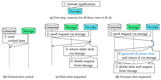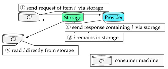 - Step②. A consumer peeks at storage to see whether the desired item is cached (Consumers can learn which files exist in the storage by subscribing to changes in the storage. For example, when we use the DropBox desktop application, we can immediately see updates on a shared DropBox folder, because the application subscribes to changes in the folder [21]). If so, the consumer reads the cached item from storage (Figure 4b). Otherwise, the consumer sends a request to the provider via storage (Figure 4c,d). Please note that multiple consumers can exist and perform these functions simultaneously.