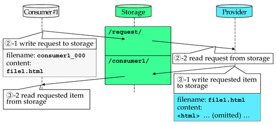 - Request. A request is written to the /request/ folder in storage, which is configured to be writable by consumers allowed to access the application. A request has a file name of the form userID_sequenceNum; userID is the consumer’s ID in storage; sequenceNum is the index of the request by the consumer, starting from zero, used to differentiate multiple requests from the same consumer. The request for an item contains this item’s ID, and a single request can ask for multiple items by including a list of their IDs. Figure 5 shows an example as follows, steps ②−1 and ②−2 together comprise step ② in Figure 4, and similarly, steps ③−1 and ③−2 comprise step ③ in Figure 4. In step ②−1, consumer #1 writes a request to /request/ folder in storage. This request has a filename consumer1_000, and it asks for file1.html. In step ②−2, the provider reads this request and prepares the requested item.