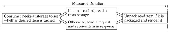 Based on the experimental setup, as described in Section 4.1, we measured the time required to access the web applications. In particular, for each instance of access to a web page, we measured the duration from when a page request is made till when the page is fully received and rendered (for the two existing methods in scenarios #1−2), as this is the response time perceived by a consumer [32]. For the proposed method in scenario #3, a consumer machine checks storage for cached items before sending a request, thus we measured the duration from when a consumer machine peeks at storage till when the page is fully received and rendered, as illustrated in Figure 6 (Please note that a web page can consist of multiple items. For example, a request for an HTML document can lead to requests for CSS, JavaScript, and image files, all of which collectively comprise the same web page. In this case, the measured time is from when the first request is sent (for scenarios #1−2) or from when the first peek at storage is made (for scenario #3) till all the items are received and rendered).