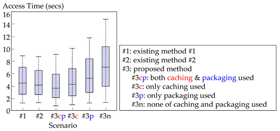 To more accurately analyze the benefits of caching and packaging in the proposed method, we evaluated access times using various subsets of these two techniques. In particular, we further divided scenario #3 into four sub-scenarios: (i) when both caching and packaging are used (scenario #3cp), (ii) when only caching is used (scenario #3c), (iii) when only packaging is used (scenario #3p), and (iv) when neither caching nor packaging is used (scenario #3n). Figure 7 shows the measurement results for application ①; the results were similar for the other two applications. When compared to scenario #3n, where no caching or packaging was used, the access times decreased when either caching or packaging was used (#3c and #3p); when both caching and packaging were used (#3cp), the access times further reduced, beyond those of the two existing methods #1 and #2. This suggests that the two techniques, caching and packaging, complement each other—packaging reduced the number of request-response exchanges, and caching reduced the time for each exchange.