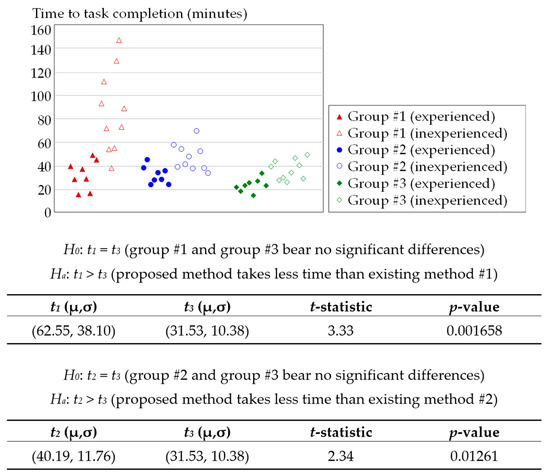 The hypotheses and results of the tests are summarized in Figure 8, including scatter plots of the individual samples. The filled triangles and empty triangles represent samples for group #1, experienced participants and those with no prior configuration experience, respectively. Similarly, the circles represent samples for group #2, and rectangles represent samples for group #3.