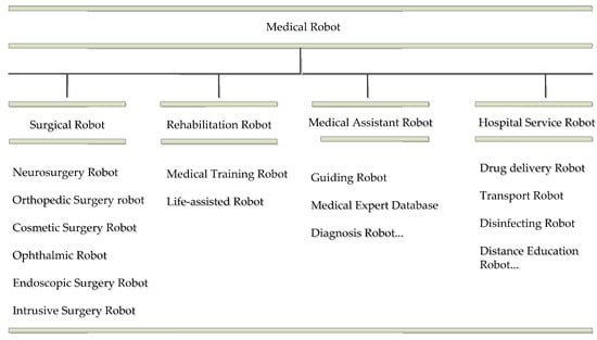 Over the years, robotics and artificial intelligence (AI) have been introduced into the daily lives of most of the world’s human population. Among the breakthrough technologies that have enabled the development of new medical devices, medical robotics is one of the most successful examples [1]. Medical robots have been utilized in multiple areas to assist humans with tasks that are repetitive, carry significant risk or require specific precision or some form of sophisticated complex ability. Novel usages for medical robots are found and described regularly [2]. During the evolution of medical care, the great advantages of medical robots have been confirmed in clinical diagnosis [3], surgical treatment [4], postoperative rehabilitation [5], home care [6], and other fields. Medical robots will certainly become increasingly important over the next few years [7,8]. In a way, medical robots have been integrated into every aspect of human life, and research and innovation of medical robots continues to develop various medical robots with different design purposes, applications, structures, materials, and intelligence levels.