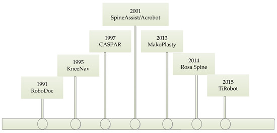 The application of surgical robots in orthopedics instigated the development of precision and minimally invasive orthopedic surgery. Further, the robots in orthopedics have received extensive and long-term attention. Since the mid-1990s, researchers have successively developed a variety of surgical robot systems used in orthopedics, which have been widely applied and promoted. The development timeline of orthopedic surgical robots is shown in Figure 3.